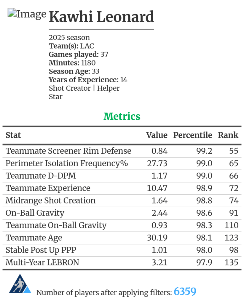 While his standard numbers have dropped with health and age, the advanced metrics show he’s still one of the NBA’s best two-way players. Kawhi, along with a revamped Clippers lineup could make some noise:
